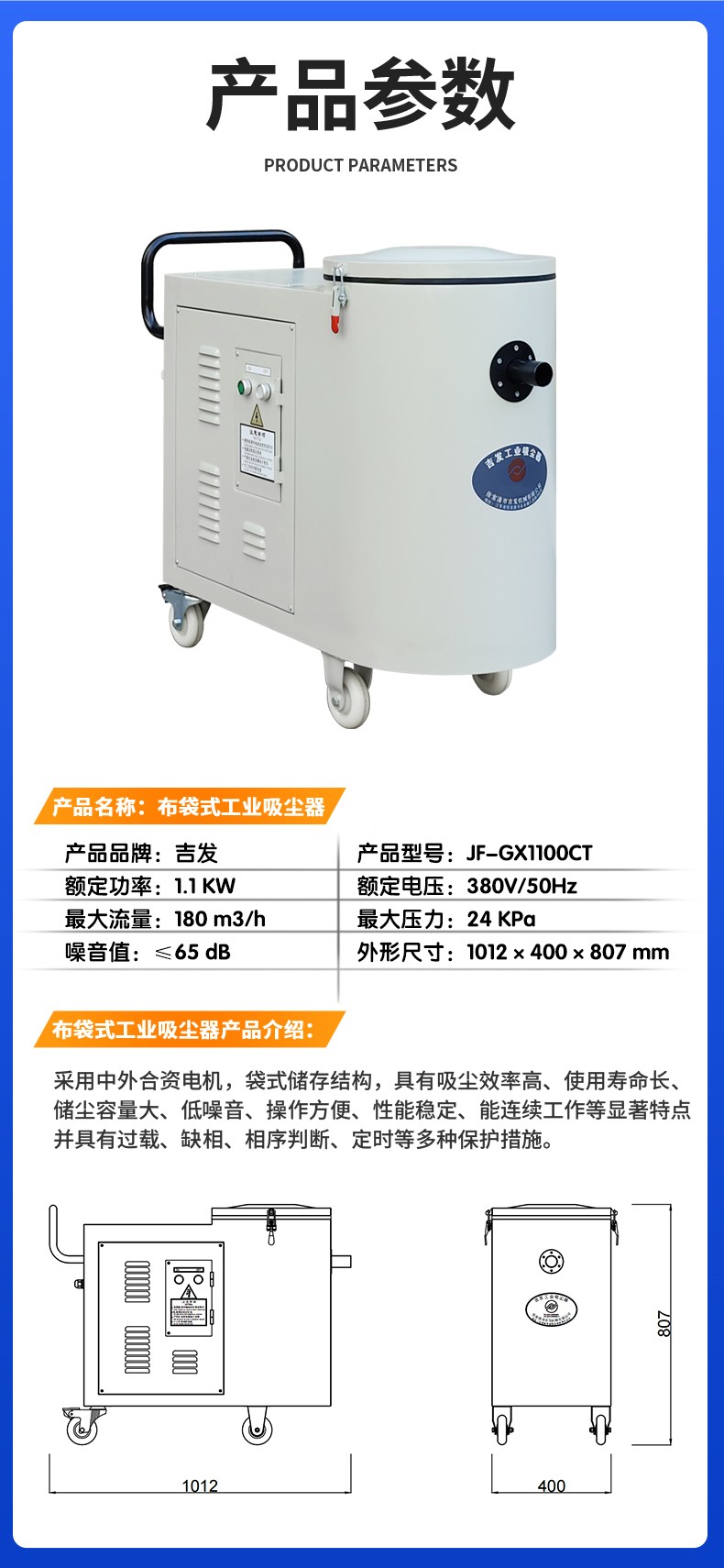 JF-GX1100CT车间用粉尘回1.1KW收布袋工业吸尘除尘设备 广泛应用于机械加工、五金打磨、木工家具、建材水泥、化工粉料、矿山砂石等行业,可高效收集金属碎屑、打磨粉尘、锯末木屑、砂石粉末、粉料颗粒等各类工业粉尘,适用于车间清扫、产尘点位就地收集、物料回收等场景,助力企业达标环保要求。