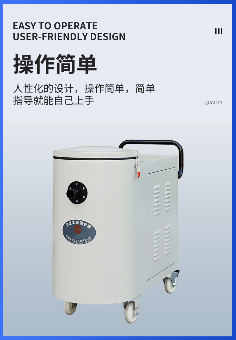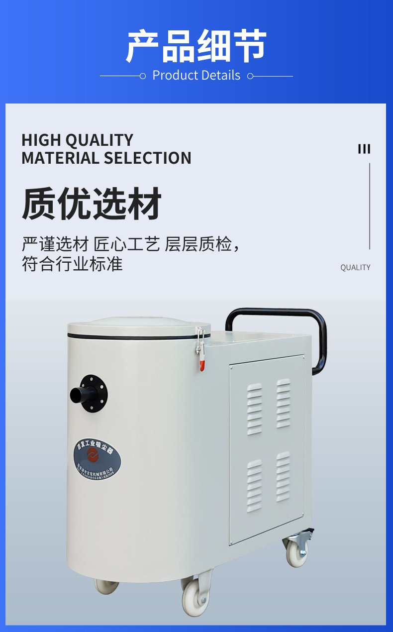 核心特点:过滤精度高,布袋滤材可高效捕捉细微粉尘,除尘效果稳定,满足工业环保排放要求;吸力强劲且持久,可连续长时间作业,不易出现吸力衰减;机身坚固耐造,采用加厚材质打造,抗冲击、耐磨损,适配恶劣工业环境;布袋易拆卸、易清洗,后期维护简便,维护成本低;密封性能优良,杜绝粉尘泄漏,运行噪音低,不影响车间正常生产;可灵活移动,适配不同产尘点位,安装使用便捷。