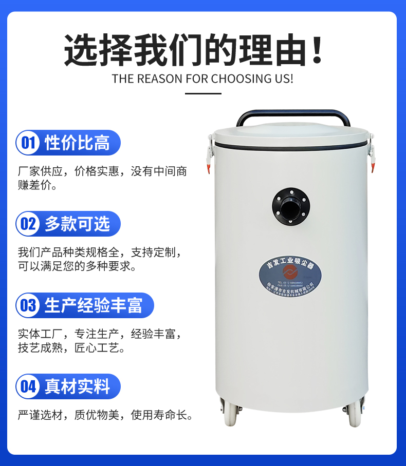 适用用途:广泛应用于机械加工、五金打磨、木工家具、建材水泥、化工粉料、矿山砂石等行业,可高效收集金属碎屑、打磨粉尘、锯末木屑、砂石粉末、粉料颗粒等各类工业粉尘,适用于车间清扫、产尘点位就地收集、物料回收等场景,助力企业达标环保要求。